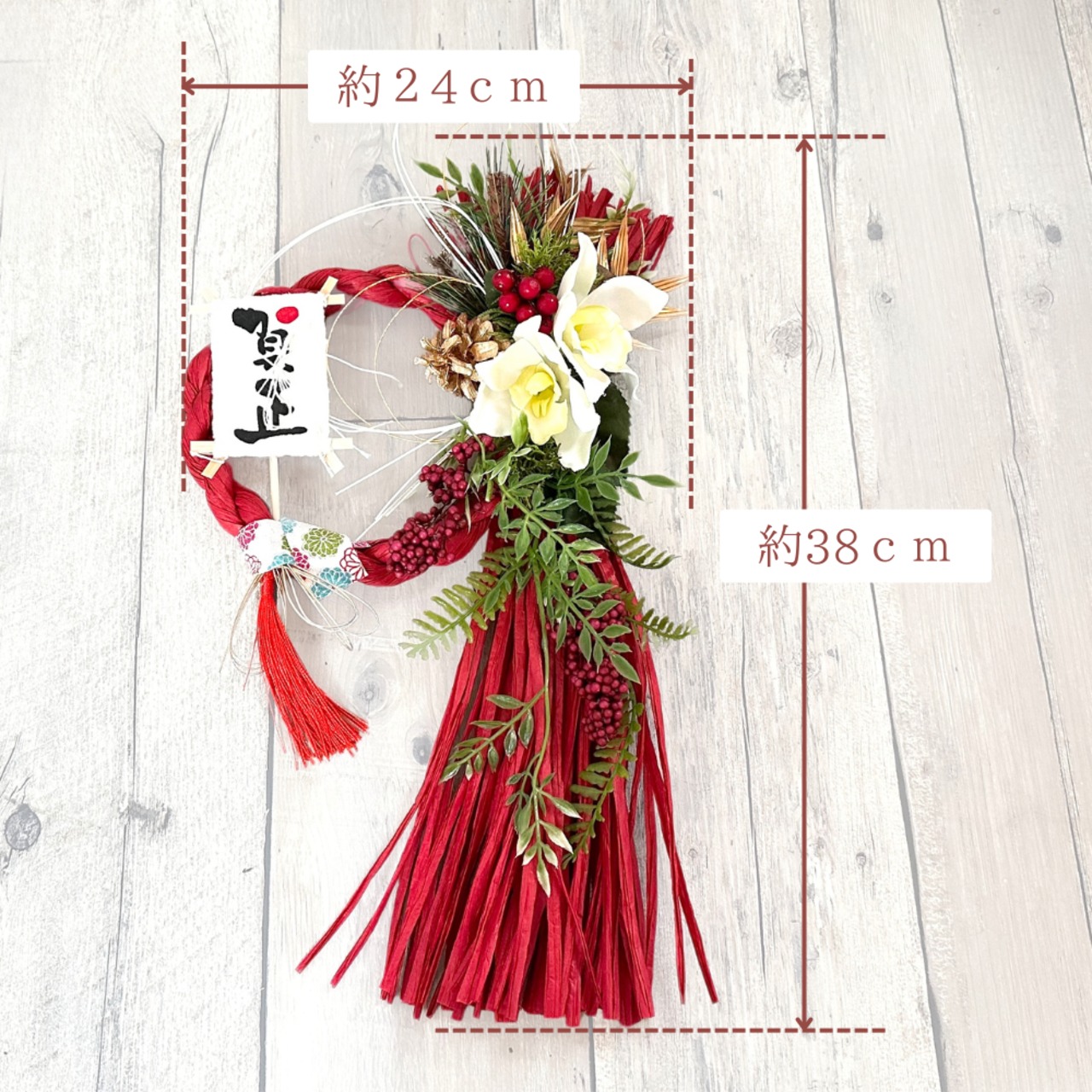 サイズは約24 cm x 約38 cmで、玄関やリビングなどのさまざまなスペースにフィットしやすく、お正月の特別な雰囲気を演出します。